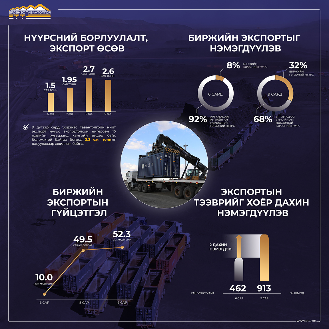 “Эрдэнэс Тавантолгой” ХК-ийн нүүрсний экспорт, гарцыг нэмэгдүүлэх, салбар хоорондын уялдааг сайжруулах арга хэмжээг богино хугацаанд авч хэрэгжүүлсний үр дүнд сүүлийн 3 сард экспортын хэмжээ, тээвэр, биржийн борлуулалт өсөж байна.
