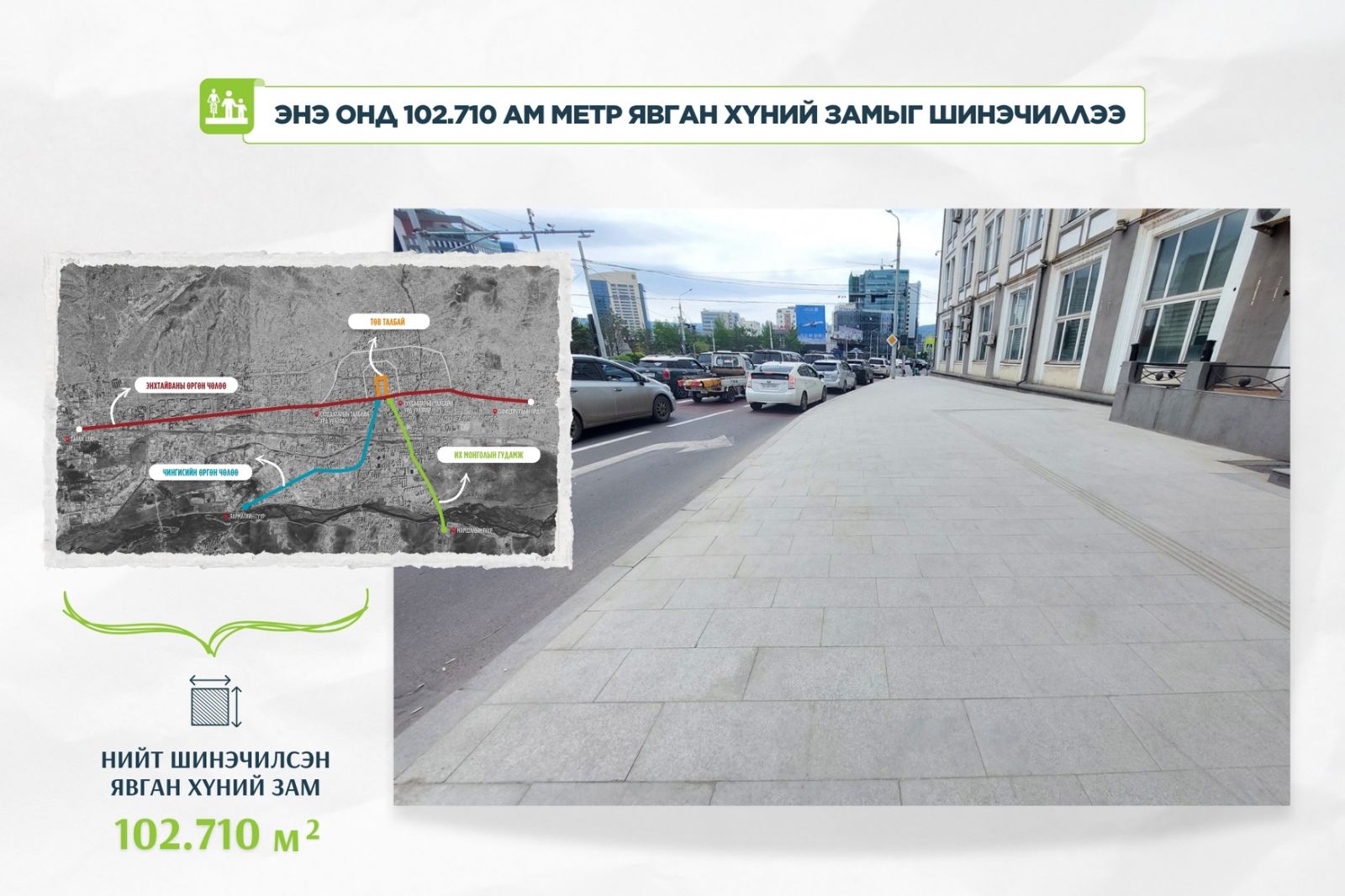 2025 онд олон жил шинэчлээгүй нийслэлийн гол гудамж замын явган хүний замыг байгалийн чулуун хавтангаар шинэчилж эхэлсэн. Тодруулбал, энэ онд нийт 15 байршилд 186.701 ам метр талбайг байгалийн чулуун хавтангаар хучихаар төлөвлөсөн. Өнөөдрийн байдлаар 102.710 ам метр талбайг байгалийн чулуун хавтангаар шинэчилж, явган хүний замын ажлыг гүйцэтгээд байна. Явган замын засвар, шинэчлэлийн ажлыг эрчимжүүлэх хүрээнд 37 албан хаагч өдөр бүр хуваарийн дагуу гүйцэтгэгч компанийн ажлын явцад хяналт тавин ажилласан. Мөн явган хүний замын хуучин хавтганаар гэр хорооллын нарийн гудам, гудамж талбайг тохижуулж байна. Тухайлбал, СХД-ийн 8, 15, 18, 20, 25, 27, 43 дугаар хорооны нарийн гудамжны явган замын нийт 1500 ам метр талбайг хуучин хавтангаар тохижуулсан.