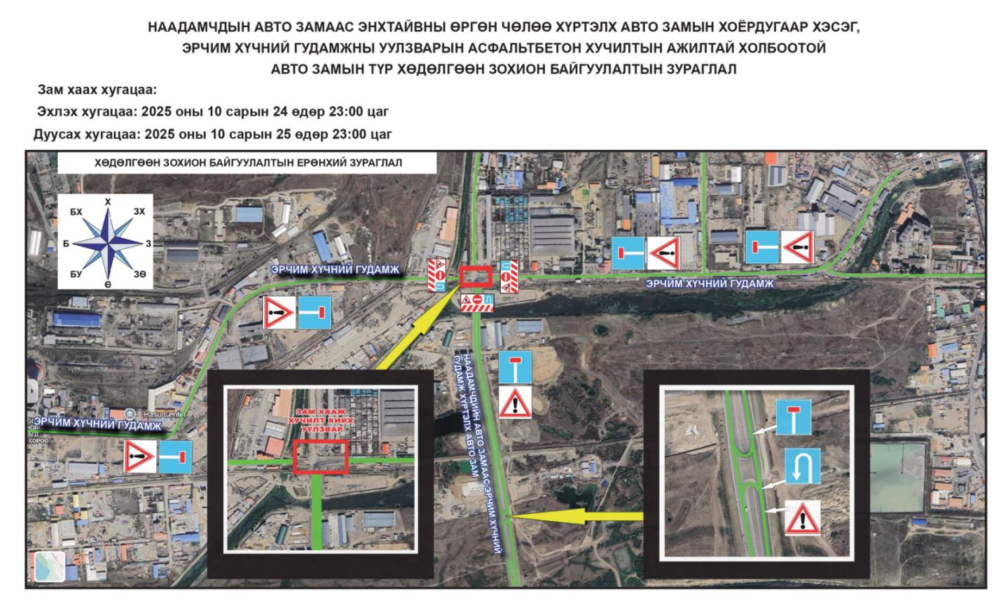 Эрчим хүчний гудамжны уулзварыг нэг хоног хааж, асфальтбетон хучилтын ажил хийнэ. Тодруулбал, Баянгол дүүргийн 20 дугаар хороо Наадамчдын авто замаас Энхтайваны өргөн чөлөө хүртэлх авто замын хоёрдугаар хэсэг, Эрчим хүчний гудамжны уулзварыг 2025 оны аравдугаар сарын 24-ний 23:00 цагаас 2025 оны аравдугаар сарын 25-ны 23:00 цагийн хооронд хааж асфальтбетон хучилтын ажил хийнэ.