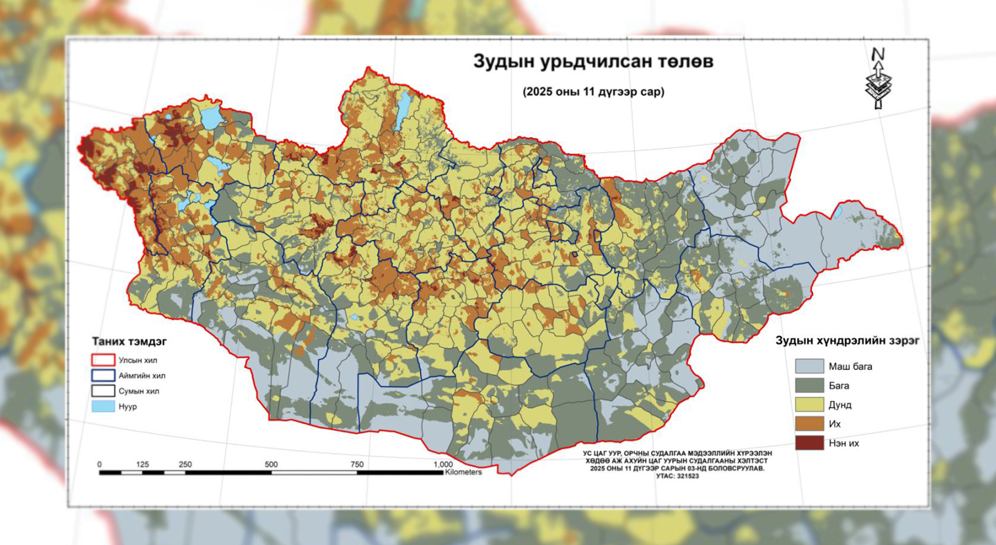 Ус цаг уур, орчны судалгаа, мэдээллийн хүрээлэнгээс 11 дүгээр сарын зудын урьдчилсан төлөвийг газрын ажиглалтын болон хиймэл дагуулын мэдээ болох ган, зуншлага, 2025-2026 оны өвөл-хаврын бэлчээрийн даац, бэлчээрийн ургац, агаарын температур, хур тунадасны дундажтай харьцуулсан хазайлт, цасны зузаан болон 11 дүгээр сарын агаарын температур, хур тунадасны урьдчилсан төлөв зэрэг мэдээлэлд үндэслэн боловсруулав.