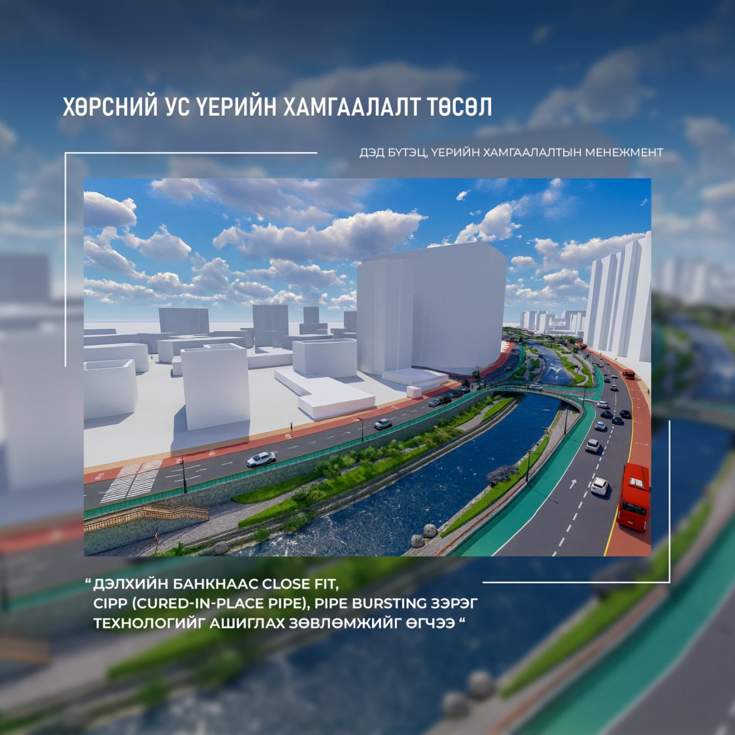 Дэлхийн банкны хөрөнгө оруулалтаар нийслэлийн есөн байршилд үерийн хамгаалалтын далан, сувгийн барилга байгууламж, борооны ус зайлуулах шугамыг шинэчлэх, өргөтгөх ажлуудыг хийнэ. Төслийн техник, эдийн засгийн үндэслэл болон байгаль орчин, нийгмийн нөлөөллийн үнэлгээг “Хот төлөвлөлт, судалгааны институт” ОНӨААТҮГ боловсруулж, Дэлхийн банкны зөвлөх баг оролцож байна. Зөвлөхийн дүгнэлтээр, Улаанбаатар хотын уур амьсгалын нөхцөл, ажлын өртөг болон гүйцэтгэлийн онцлогийг харгалзан шугам хоолойг шуудуу ухалгүйгээр доторлох, шинэчлэхэд дэвшилтэт технологийг ашиглах талаар санал болгожээ. Энэ хүрээнд Улаанбаатар хотын уур амьсгалын нөхцөл, гүйцэтгэх ажлын зардлыг хэмнэх, гүйцэтгэхэд хялбар байх зэрэг нөхцөлөөс шалтгаалан Close fit, CIPP (Cured-In-Place Pipe), Pipe bursting зэрэг технологийг ашиглах санал, зөвлөмж өгсөн байна. Энэхүү CIPP болон Close-Fit нь нөхөн сэргээх технологи бөгөөд хуучин хоолойг ашиглан дотор нь шинэ бүтэц үүсгэдэг бол, Pipe Bursting нь бүрэн солих технологи аж.