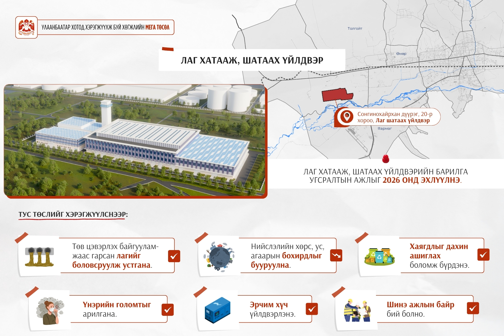 Манай улсад лаг шатаах үйлдвэр байхгүй. Тиймээс лагийг хатаахдаа талбайд буулгаж, байгалиар нь хатаах аргыг хэрэглэж буй. Энэ нь агаар, орчинд сөрөг нөлөө үзүүлдэг. Иймд инженерийн дэд бүтцийг сайжруулах хүрээнд “Лаг хатааж, шатаах үйлдвэр”-ийн төслийг 2025-2027 онд хэрэгжүүлэхээр төлөвлөсөн. Төслийн талбай ойролцоогоор 40 мянган ам.метр бөгөөд Улаанбаатар хотын бохир ус цэвэрлэх байгууламжийн урд талд буюу Сонгинохайрхан дүүргийн 20 дугаар хороонд байрлах юм. Тус үйлдвэр нь хоногт 250 метр.куб лагийг хатаан, шатаах хүчин чадалтай бөгөөд шатаасан лаг нь 5-6 метр.куб үнс болно. Улаанбаатар хотод тус үйлдвэрийг барьснаар нийслэлийн хөрс, ус, агаарын бохирдлыг бууруулах, үнэрийн голомтыг арилгах, эрчим хүч үйлдвэрлэх, хог хаягдлыг дахин ашиглах зэрэг олон талын үр ашигтай, цогц шийдэл болох юм. Төслийн ТЭЗҮ-ийг боловсруулж дууссан бөгөөд төр, хувийн хэвшлийн түншлэлээр хэрэгжүүлэхээр төлөвлөж байна. Энэ хүрээнд төр, хувийн хэвшлийн түншлэлийн төслийн талаар зах зээлийн судалгаа хийх, хувийн хэвшлийн түншлэгчийн хөрөнгө оруулалтыг татах, тандан судлах, хувийн хэвшлийн түншлэгчийг тодорхойлох зорилгоор мэдээлэл, тооцоо, шинжилгээ, судалгаа бүхий төслийн саналыг хүлээн авч дууссан. Цаашид Төр, хувийн хэвшлийн түншлэлийн тухай хууль, журмын дагуу төслийн бүрэн шинжилгээ хийхээр бэлтгэж байна.