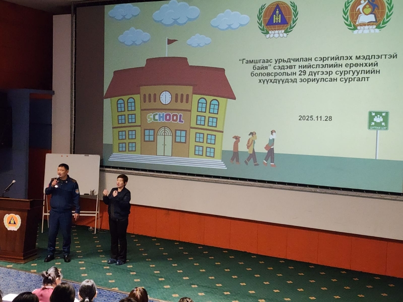 Сургалтын нэгдүгээр үе шатны хүрээнд өнөөдөр Гамшгаас хамгаалах сургалтын төв 116 дугаар ангид нийслэлийн ерөнхий боловсролын 29 дүгээр сургуулийн дунд, ахлах ангийн 105 сурагчдад гамшгаас хамгаалах мэдлэг олгох дадлага сургуулилтыг хийж, анхан шатны мэдлэг эзэмшүүллээ.