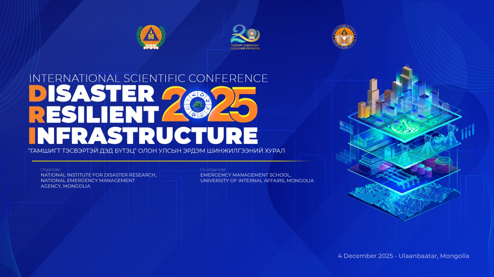 Тиймээс Шинжлэх ухааны ажилтны өдрийг тохиолдуулан ОБЕГ-ын дэргэдэх Гамшиг судлалын үндэсний хүрээлэн, ДХИС-тай хамтран “Гамшигт тэсвэртэй дэд бүтэц” – Disaster resilient infrastructure” олон улсын эрдэм шинжилгээний хурлыг энэ сарын 04-нд зохион байгуулах гэж байна.