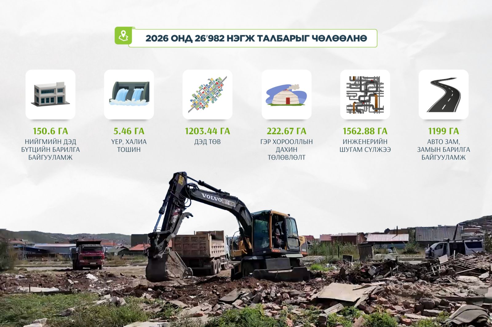 Газар чөлөөлөлтийн бэлтгэлийг хангах үүргийн дагуу нийслэлийн 2026 оны газар зохион байгуулалтын төлөвлөгөөнд дөрвөн бүлгийн 14 дэд бүлэгт хамаарах 793 төсөл арга хэмжээг хэрэгжүүлэхээр тусган, батлуулсан. Үүнээс 2026 онд 341 төсөл, арга хэмжээний 26982 нэгж талбарын 4344,05 га газрыг нөхөн олговортойгоор чөлөөлөхөөр бэлтгэл хангаж байна.
