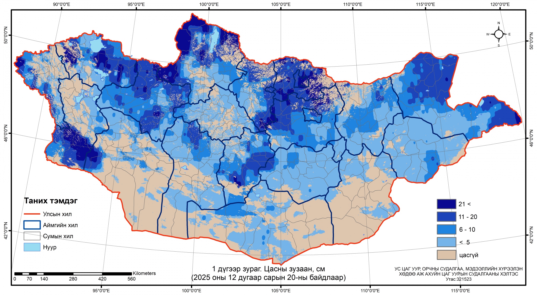 Цаг уурын байгууллагаас арав хоногт нэг удаа хийдэг хээрийн цасны хэмжилтийн мэдээгээр арваннэгдүгээр сарын 20-ны байдлаар нийт нутгийн 79 хувьд цастай байна. Үүнээс Увсын Ховд, Бөхмөрөн, Цагаанхайрхан, Малчин, Ховдын Алтай, Үенч, Хөвсгөлийн Цагааннуур, Улаан-Уул, Цагаан-Үүр, Цэцэрлэг, Өвөрхангайн Гучин-Ус, Булганы Рашаант, Дашинчилэн, Баяннуур, Сэлэнгийн Ерөө, Түшиг, Орхонтуул, Хүдэр, Мандал, Дархан-Уулын Шарын гол, Хонгор, Төвийн Эрдэнэд 20 см-ээс дээш.