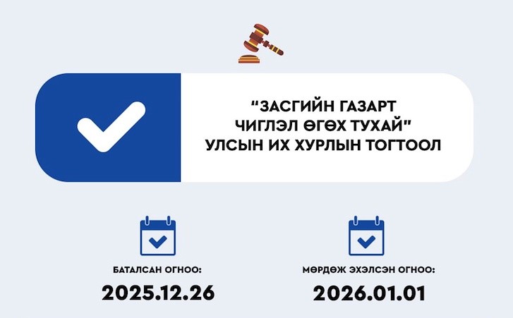 “Засгийн газарт чиглэл өгөх тухай” Улсын Их Хурлын тогтоолыг 2026 оны 01 дүгээр сарын 01-ний өдрөөс эхлэн дагаж мөрдөж байна.