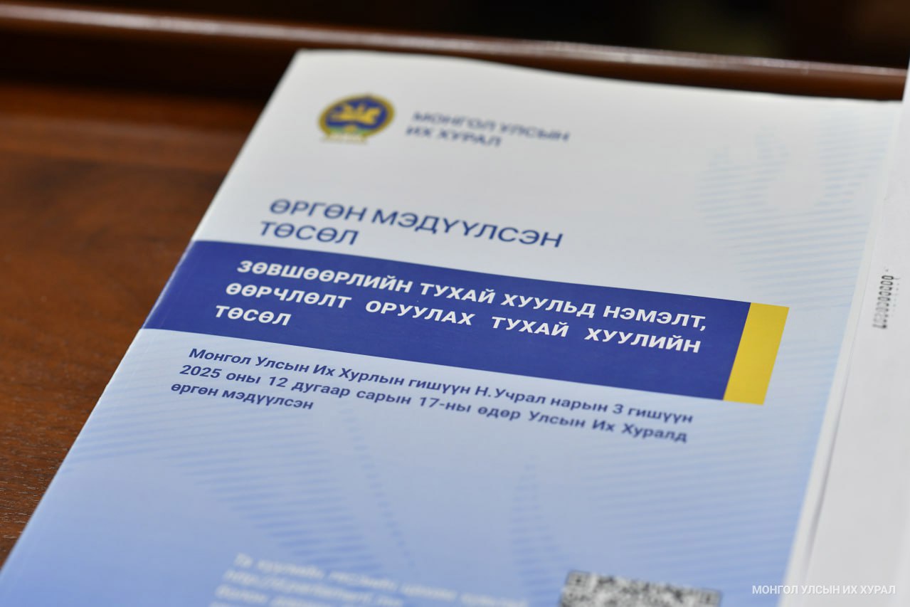 Улсын Их Хурлын гишүүн Х.Ганхуяг, Н.Учрал, Б.Заяабал нар 2025 оны 12 дугаар сарын 17-ны өдөр Зөвшөөрлийн тухай хуульд нэмэлт, өөрчлөлт оруулах тухай болон холбогдуулан боловсруулсан 89 төслийг өргөн мэдүүлсэн бөгөөд Улсын Их Хурал хэлэлцэхийг дэмжсэн юм. Иймд Улсын Их Хурлын даргын 2026 оны 22 дугаар захирамжаар хуулийн төслүүдийн хэлэлцүүлэг бэлтгэх үүрэг бүхий ажлын хэсгийг Д.Энхтүвшин гишүүнээр ахлуулан, 21 гишүүний бүрэлдэхүүнтэйгээр байгуулсан.