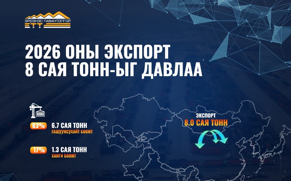 “Эрдэнэс Тавантолгой” ХК 2026 оны 03 дугаар сарын 18-ны өдрийн байдлаар нийт 8 сая тонн нүүрс экспортлоод байна. Үүнээс Гашуунсухайт боомтоор 6.7 сая тонн буюу 83 хувь, Ханги боомтоор 1.36 сая тонн буюу 17 хувийг экспортоллоо.