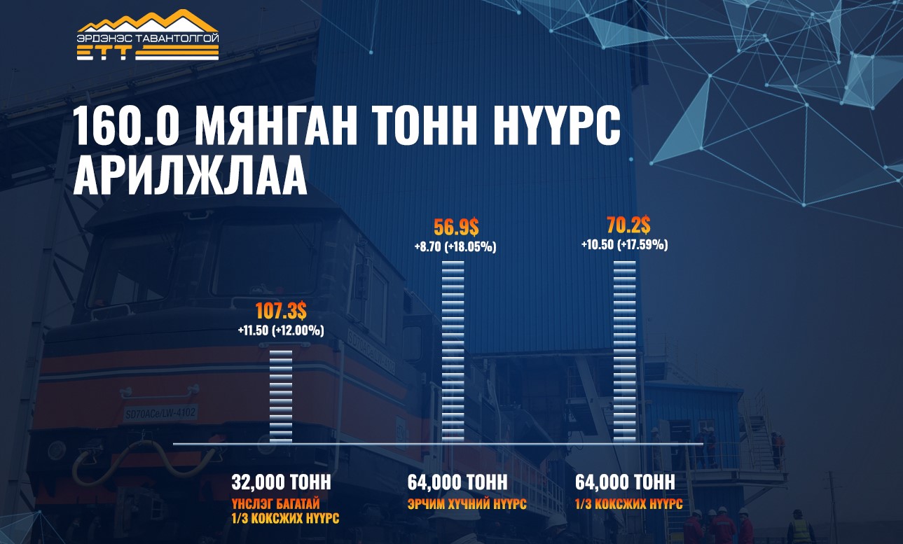 “Эрдэнэс Тавантолгой” ХК 2026 оны 03 дугаар сарын 23-ны өдөр Монголын Хөрөнгийн Биржээр дамжуулан 3 удаагийн амжилттай арилжаагаар 160.0 мянган тонн нүүрсийг нийт 11.6 сая ам.долларын үнийн дүнтэйгээр БНХАУ-ын боомт хүргэж өгөх нөхцөлөөр арилжааллаа.