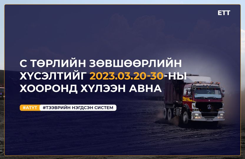 “Эрдэнэс Тавантолгой” ХК 2023 оны 2-р улирлын Гашуунсухайт – Ганцмод боомтоор улс хоорондын ачаа тээвэрлэх “С” төрлийн зөвшөөрлийн бичгийн хүсэлтийг 2023 оны 3-р сарын 20-ны 13.00 цагаас 30-ны өдрийн 24:00 цагийн хооронд Авто тээврийн үндэсний төвийн ТЭЭВРИЙН НЭГДСЭН СИСТЕМ-ээр дамжуулан хүлээн авна.